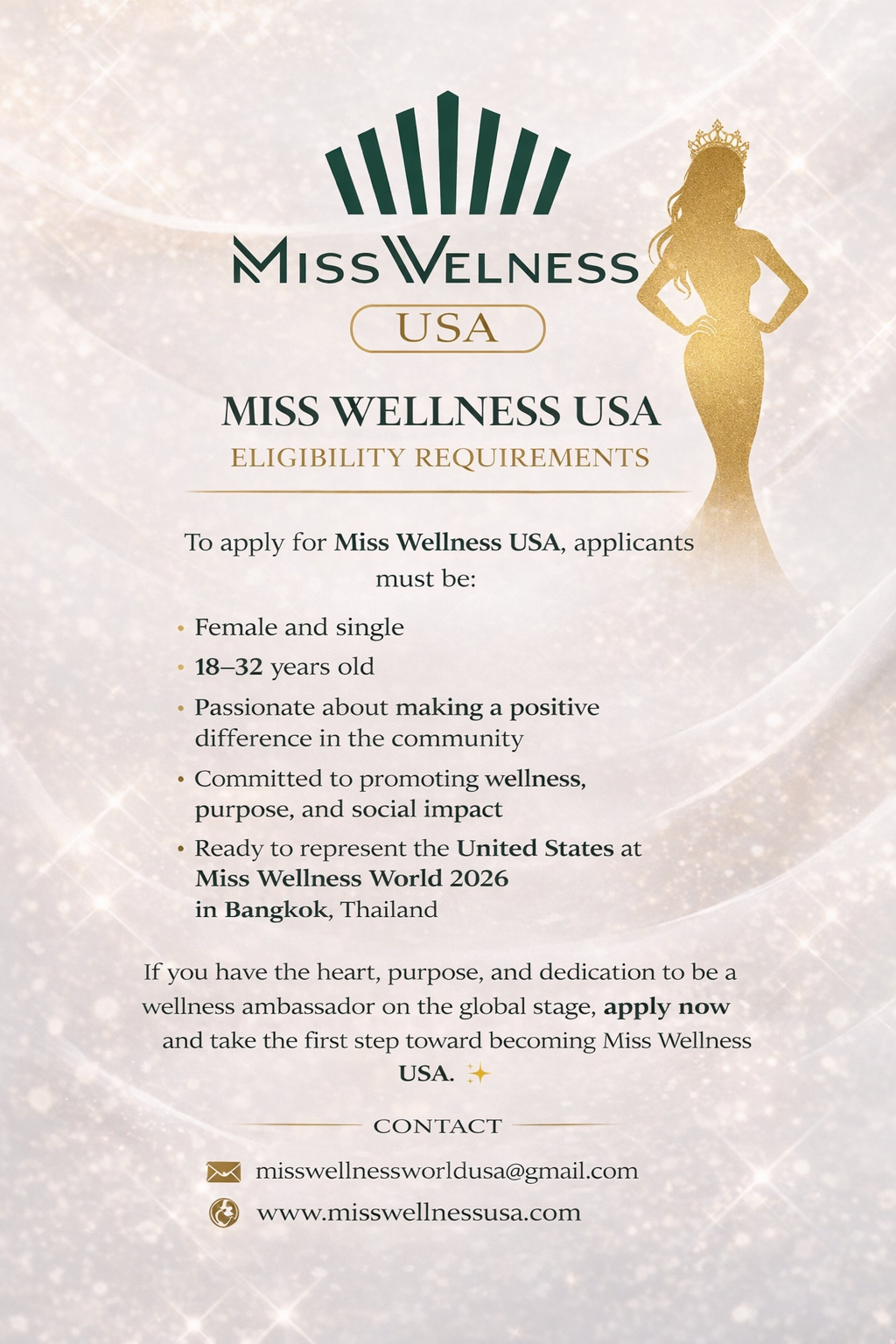 • Ready and willing to represent the United States at Miss Wellness World 2026 in Bangkok, Thailand